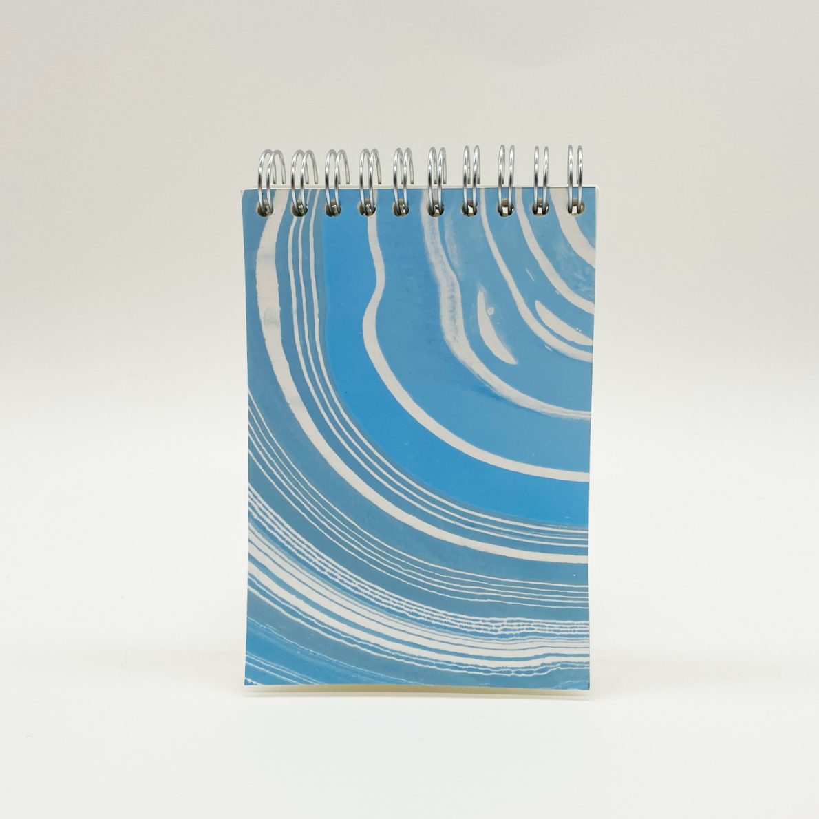A handy notebook for your lists and thoughts with easy to tear pages. The front cover is hand marbled and therefore one of a kind. The back cover has a sturdy greyboard, whiteboard or a white cardboard with BLANKBOOK embossed. The inlay has around 60 pages of 115 gsm smooth warm white paper saved from a printshop.