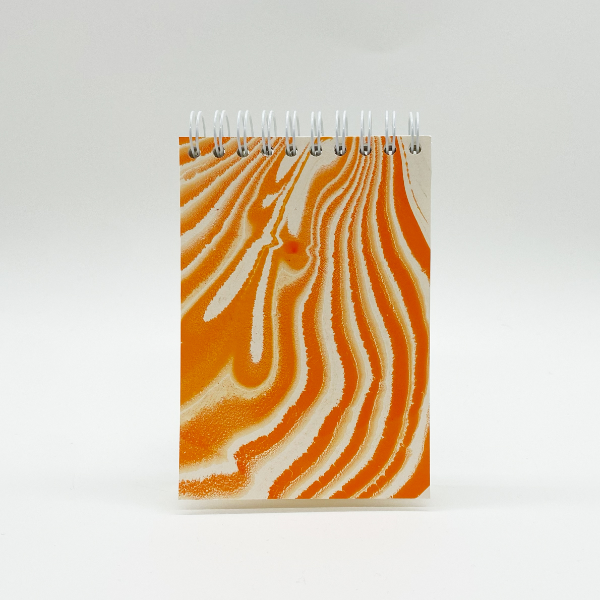 A handy notebook for your lists and thoughts with easy to tear pages. The front cover is hand marbled and therefore one of a kind. The back cover has a sturdy greyboard, whiteboard or a white cardboard with BLANKBOOK embossed. The inlay has around 60 pages of 115 gsm smooth warm white paper saved from a printshop.