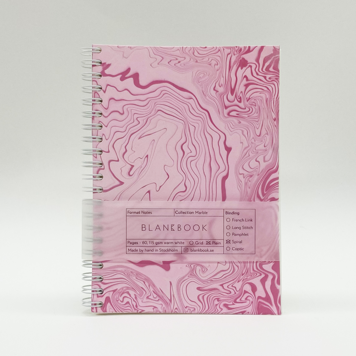 A handy notebook for your lists and thoughts with easy to tear pages. The front cover is hand marbled and therefore one of a kind. The back cover has a sturdy greyboard, whiteboard or a white cardboard with BLANKBOOK embossed. The inlay has around 60 pages of 115 gsm smooth warm white paper saved from a printshop.