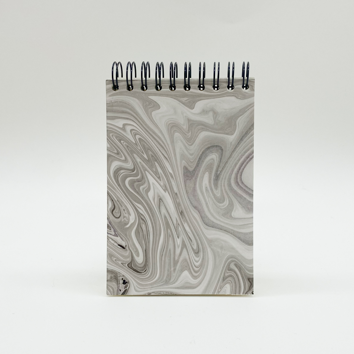 A handy notebook for your lists and thoughts with easy to tear pages. The front cover is hand marbled and therefore one of a kind. The back cover has a sturdy greyboard, whiteboard or a white cardboard with BLANKBOOK embossed. The inlay has around 60 pages of 115 gsm smooth warm white paper saved from a printshop.